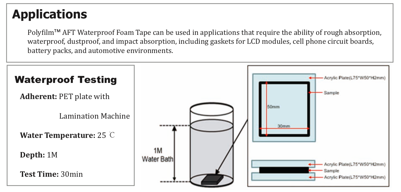 TM AFT 系列防水泡棉膠帶是一種雙面膠帶,由丙烯酸泡棉和丙烯酸粘合劑組成。這種防水泡棉帶由于其微觀和獨(dú)立的細(xì)胞結(jié)構(gòu)而非常薄和柔軟。它具有高沖擊吸收、優(yōu)異的防水性能、良好的防塵性能和回彈性。" />